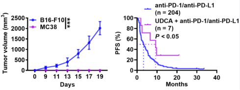 图6. 非小细胞肺癌患者的回顾性分析,显示抗PD-1或抗PD-L1单独或UDCA与抗PD-1或抗PD-L1联合治疗的肿瘤患者无进展生存期(右图)