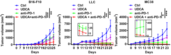 图4. UDCA和抗PD-1联合治疗的抗肿瘤效应