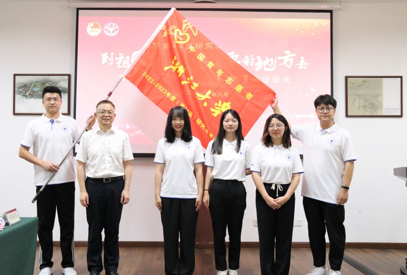 6月28日,浙江大学第24届研究生支教团出征仪式在紫金港校区求是大讲堂举行。校党委副书记傅强为第24届研究生支教团授旗。