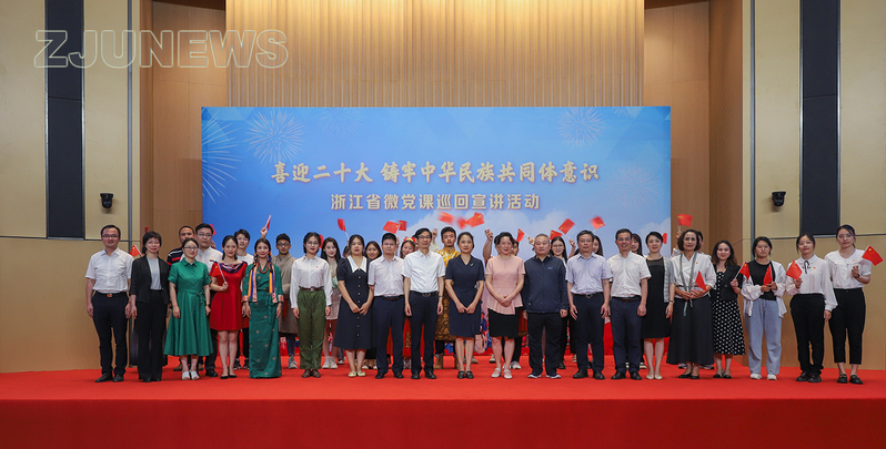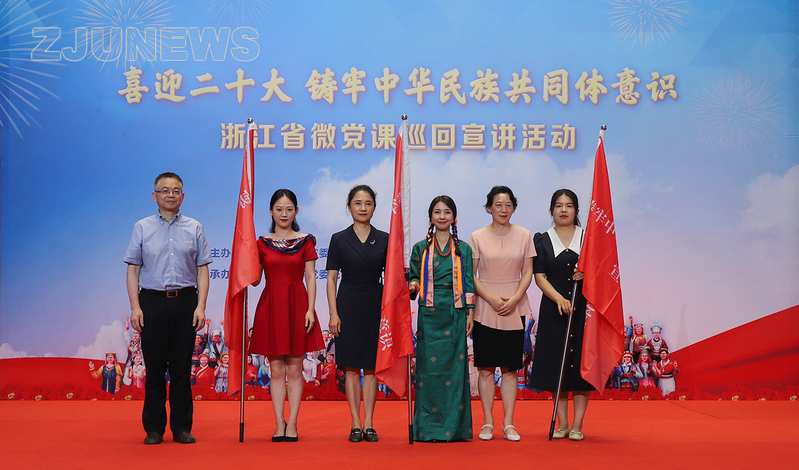 6月29日下午,“喜迎二十大·铸牢中华民族共同体意识”宣讲团出征仪式暨全省微党课巡回宣讲走进浙江大学活动在紫金港校区举行。省民宗委副主任金伟、省委宣传部二级巡视员施丽琴、浙江大学党委副书记傅强出席活动。