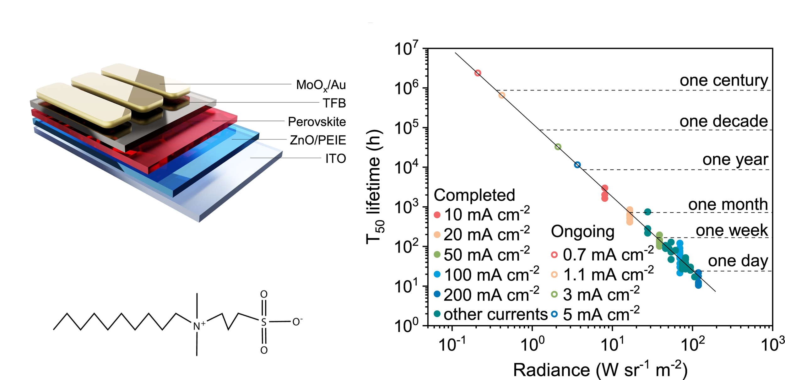 器件T50寿命与辐亮度的关系(右图)。来源: Nature Photonics (2022)。