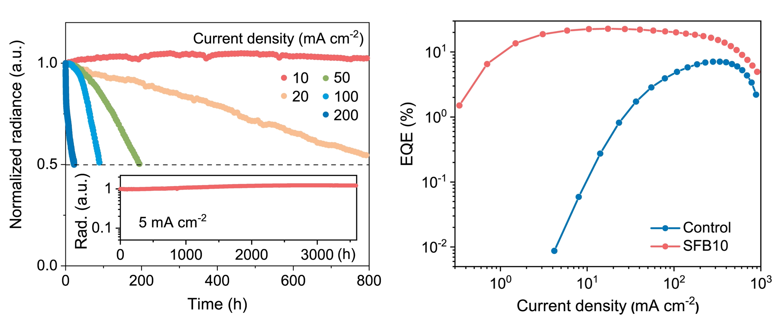 钙钛矿LED的长时间工作与加速老化实验(左图);对照组与稳定后器件的外量子效率数据(右图)。