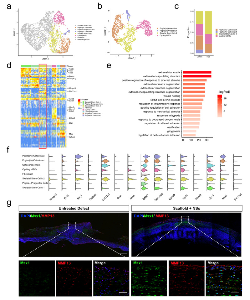 本研究开发了一种含NSs的3D打印水凝胶支架原位细胞培养系统,在体外促进了间充质干细胞 (MSCs) 的强劲扩增,并成功实现了体内临界尺寸颅骨缺损的全层再生(上下两层皮质骨板和中间一层松质骨/骨髓腔)。通过单细胞 RNA-Seq 分析,本研究发现在骨损伤修复过程中特定的组织工程移植物调控特定再生细胞亚群图谱。进一步数据分析发现,含 NSs 的原位培养系统局部扩增了 Msx1+ 骨骼干细胞 (SSCs) 亚群,并结合拟时间分析与谱系追踪实验揭示了其通过软骨内成骨途径促进高效骨愈合。此外,这种含有 NSs 的水凝胶支架培养系统具有高度的生物相容性,可通过标准生产工艺进行量化生产,并具有一定的临床应用潜力。
