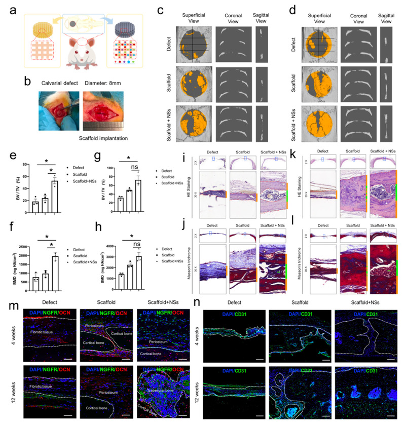 图2 移植含NSs的3D打印水凝胶支架体系促进临界尺寸颅骨缺损的全层再生