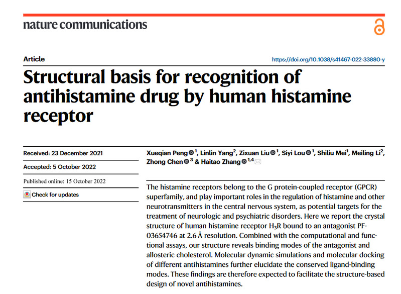 2022年10月15日,浙江大学药学院张海涛研究员团队在国际顶尖期刊《Nature Communications》上发表了题为“Structural basis for recognition of antihistamine drug by human histamine receptor”的研究论文。该研究利用蛋白质晶体学方法,解析了人源组胺受体H3R与拮抗剂PF-03654746的复合物晶体结构,结合计算和功能实验结果,系统地阐明了拮抗剂PF-03654746和变构调节分子胆固醇的独特结合模式以及不同拮抗剂的保守结合模式,为基于H3R的药物设计提供结构基础。