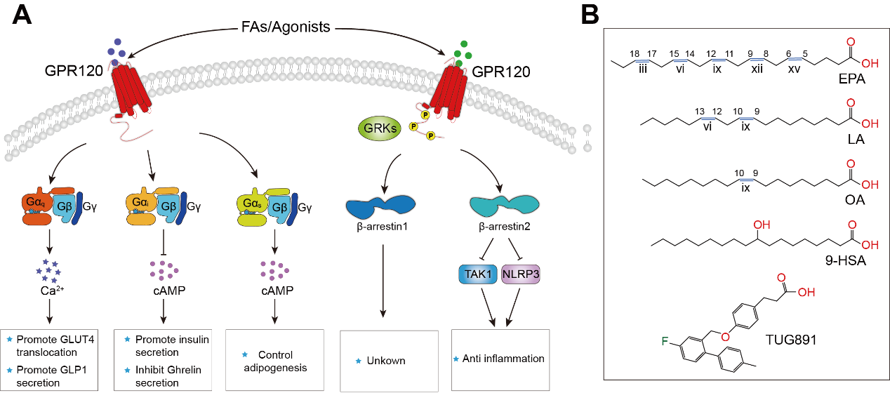 之前的研究发现,Omega-3脂肪酸要想在人体里发挥作用,需要一个帮手——Omega-3鱼油受体。Omega-3鱼油受体(GPR120,FFAR4)属于人体中最庞大的膜蛋白家族G蛋白偶联受体(GPCR)家族,具有促进胰岛素敏化、刺激GLP-1分泌和控制脂肪生成等多种作用。它可以识别Omega-3脂肪酸在内的多种饱和与不饱和长链脂肪酸。受体被激活后可以与多种下游效应物偶联,包括多种G蛋白(Gs, Gi, Gq)和β阻遏蛋白(β-arrestin)等,再引发相应的细胞响应和生理作用。但不同的脂肪酸激活Omega-3鱼油受体的效果并不同,其中只有某些不饱和脂肪酸是对人体是有益的。