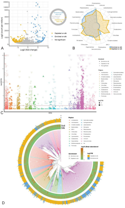 本研究解析的“丝绸际”和土壤对照间显著差异的ASVs及其丰度分布和分类学特征