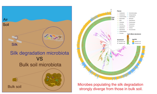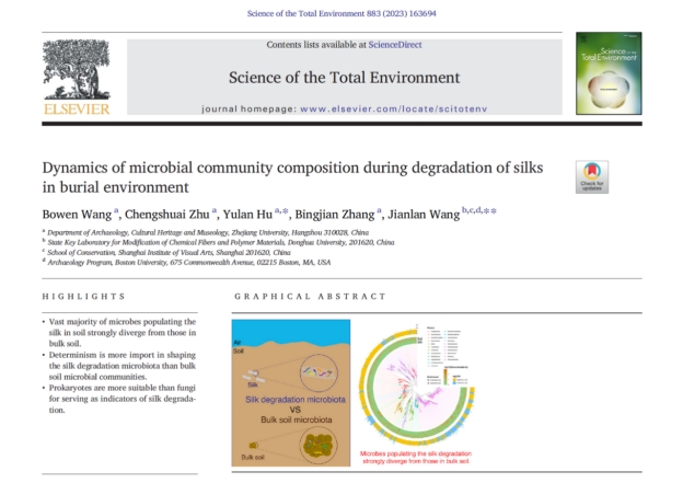 近日,浙江大学艺术与考古学院考古与文博系文物保护材料实验室胡瑜兰/张秉坚团队在环境科学与生态学领域国际权威Top期刊 《Science of the total environment》发表了题为《Dynamics of microbial community composition during degradation of silks in burial environment》的论文。该研究成果结合生物信息学、微生物生态学和文物保护学等多学科的研究手段,通过模拟丝绸材料在土壤中的降解过程,解析了埋藏环境中参与丝绸降解的微生物的群落组成动态,为丝绸文物保护领域研究提供了重要的微生物生态学信息,也为用于土壤中考古残留物检测的科技考古新技术的开发提供了一个新颖的工具,即除了对古代有机遗存采用植物浮选、DNA解析、同位素分析技术以外,土壤中的微生物群落结构信息在机器学习的辅助下也可以作为科技考古的一个有力手段。本研究为科技考古开创了一个新的研究方向,目前在国内外都没有相关的报道,是浙江大学在科技考古方向的创新性研究。