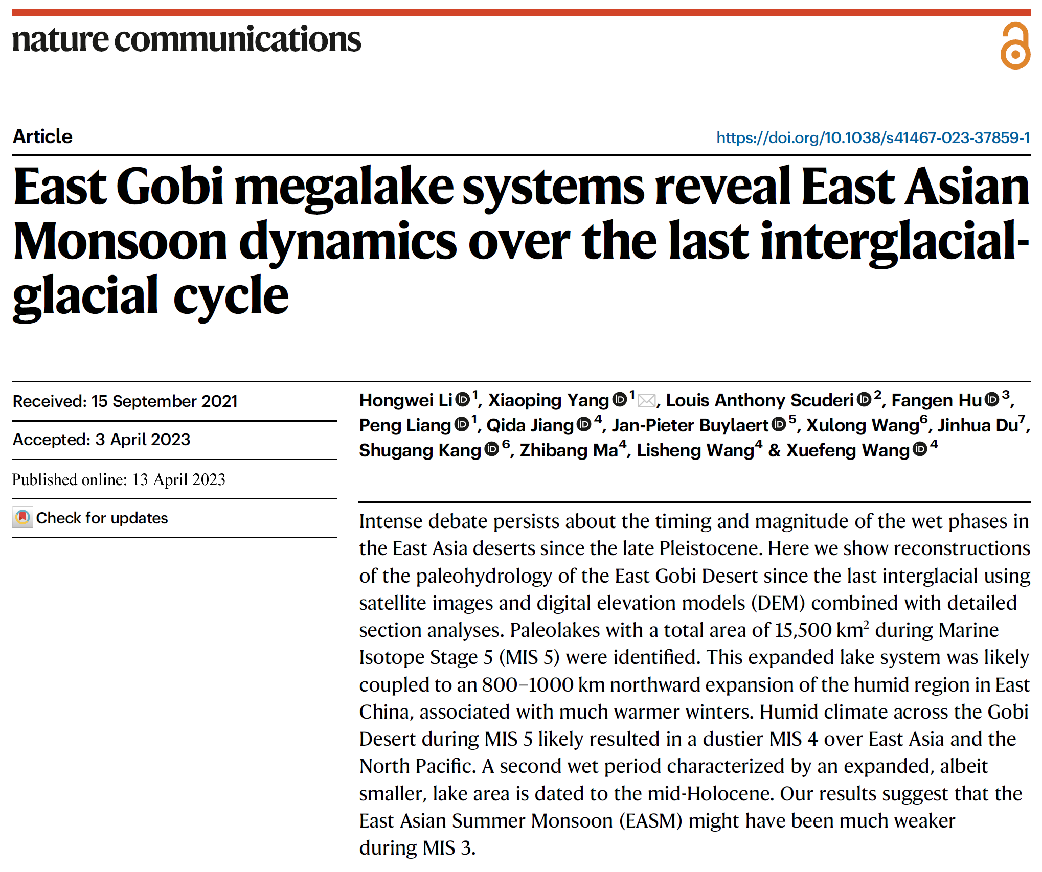 论文详见:Li, H., Yang, X., Scuderi, L.A. et al. (2023). East Gobi megalake systems reveal East Asian Monsoon dynamics over the last interglacial-glacial cycle. Nature Communications, 14, 2103. https://doi.org/10.1038/s41467-023-37859-1