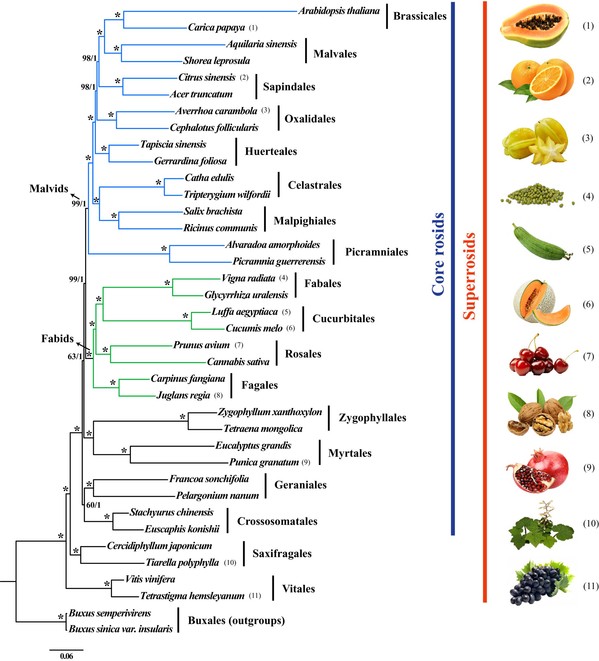 超蔷薇类约占所有被子植物的四分之一以上,包含虎耳草目、葡萄目和核心蔷薇类(16个目)。超蔷薇类植物具有显著的形态和生态多样性,包括许多重要的农作物、水果以及林木,具有重要的经济价值与观赏价值。尽管超蔷薇类长期以来一直是系统发育研究的焦点,但一些问题仍未得到解决,主要集中在:1)超蔷薇类的基部类群问题;2)COM支系是否为单系以及其归属问题;3)牻牛儿苗目、缨子木目、蒺藜目、桃金娘目和腺椒树目之间的系统发育关系。