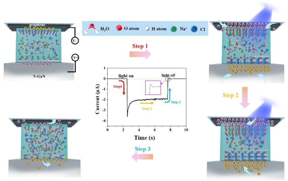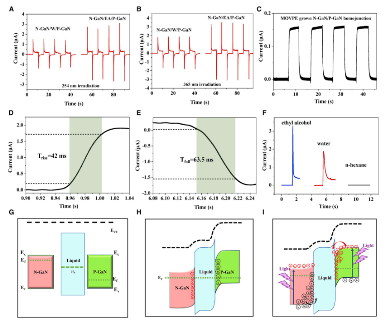 本次研究揭示了液体基高性能紫外光电探测器,在石墨烯/半导体异质结插入水等极性液体可以在光照下产生持久的光极化电流。在光照下,由于极性体化学势和半导体费米能级的不同,光生电子和空穴将不断地向固液界面移动,为解决探测器受限于晶格匹配限制和检测波长随意可调提供了新的思路。在未来的研究中,将着重于设计柔性可穿戴的健康监测设备进行重要补充。并解决目前限制异质结探测器晶格匹配的各种问题,并通过光电监测设备为人体无创健康评估提供各种关键信息。
