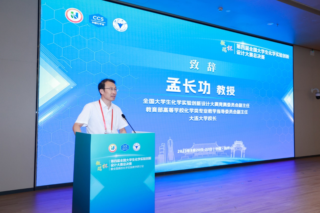 孟长功向进入决赛的各位同学及其指导教师表达了热烈的祝贺。他表示,全国大学生化学实验创新设计大赛自2019年创办以来已连续举办四届,成为目前列入全国大学生竞赛榜单的唯一的化学类学科竞赛,影响力不断提升。此次竞赛是疫情过后首次全面的线下比赛,给参赛师生搭建了一个面对面的交流平台,希望各位老师在此次竞赛中深入交流,各位同学充分学习,并预祝取得优异成绩。
