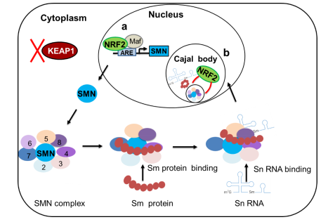 该研究中研究者首先利用NRF2敲低的细胞株进行高通量RNA-seq,分析结果显示,非小细胞肺癌A549细胞中的NRF2敲低导致了485个基因发生了839个选择性剪接(AS)事件,并且这种调控能力与其转录活性无关。研究发现SMN的mRNA表达水平与癌症基因组图谱中的肺鳞状细胞癌患者NRF2通路的改变显著相关,推测NRF2可能通过SMN介导RNA剪接调控的功能。ChIP、ARE-pulldown等实验证明了 NRF2通过与SMN1启动子中的两个抗氧化反应元件(ARE)结合来调节SMN mRNA表达。此外,Co-IP、GST-pull down 等生化与分子生物学实验不仅证明了NRF2与SMN蛋白的直接相互作用,而且还明确了NRF2的Neh2结构域以及SMN的YG box和外显子7编码的区域是它们相互作用所必需的。研究还发现,NRF2 在Cajal 体中与 SMN 和 Gemin2 形成复合物,表明NRF2是Cajal体的一个新组成部分,可能参与剪接体snRNP的生物发生。现有研究表明Cajal bodies是剪接体snRNP加工和成熟的重要场所。