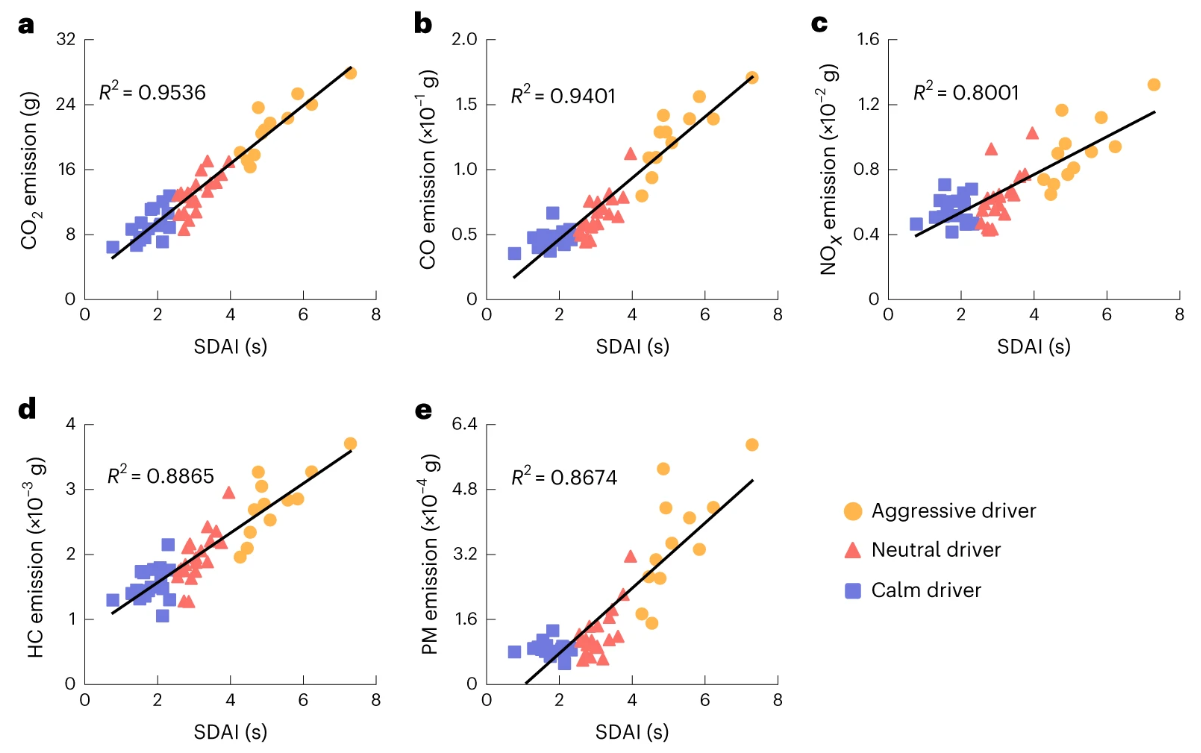 研究人员通过排放模型对真实轨迹进行污染标定,估计每种驾驶方式的污染物排放量,分析二氧化碳和四种主要污染物的排放情况,结果显示标准化驾驶激进性指数与排放之间存在近似线性关系,意味着驾驶行为越激进,跟驰阶段的车辆排放越多。