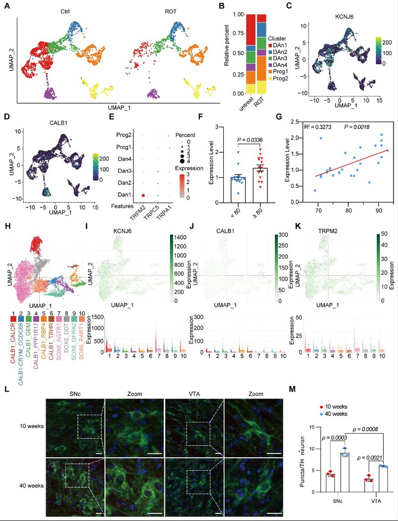 首先,通过对单细胞组学数据和帕金森病人表达谱数据库的分析,该研究发现,TRPM2在易感多巴胺能神经元亚群中呈现明显的高表达,其表达水平在帕金森病人以及帕金森小鼠模型中与年龄也呈现明显的正相关(图1)。