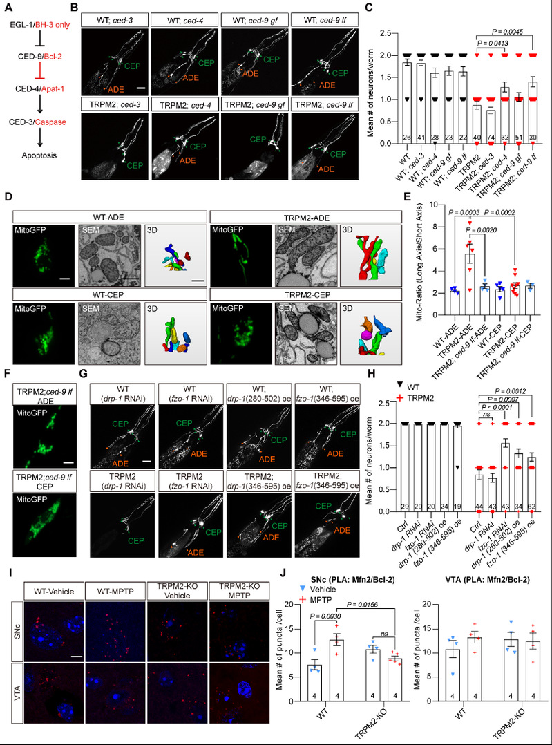 进一步研究发现,在ADE神经元中,PARP-1/PARG-1偏好性地介导了TRPM2的配体ADPR的生成从而激活TRPM2(图3),引起钙离子稳态失衡和活性氧产生并引发CED-9/FZO-1互作,进而介导线粒体过度融合和功能障碍(图4),该通路是导致ADE选择性死亡的关键。该机制在帕金森小鼠黑质多巴胺能神经元选择性丢失过程中保守存在(图4)。