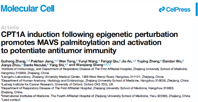 2023年12月7日,浙江大学基础医学院/良渚实验室生万强课题组与牛津大学Ludwig癌症研究所施扬教授课题组合作,在Molecular Cell杂志上发表了题为“CPT1A induction following epigenetic perturbation promotes MAVS palmitoylation and activation to potentiate antitumor immunity”的研究论文,从比较表观干预和病毒感染在引起I型干扰素应答的异同入手,细致地揭示了线粒体蛋白CPT1A响应不同刺激信号调控MAVS蛋白S-棕榈酰化修饰的分子机制和产生的重要作用。