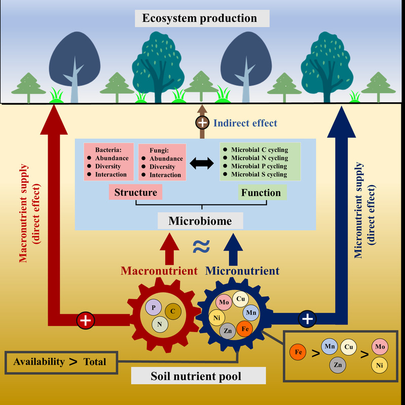 目前,微量元素对微生物组的贡献在海洋生态系统和人类肠道系统中已被证实。而微量元素与土壤生态系统中的微生物群落和功能也可能存在关联,主要原因如下:首先,土壤微生物繁殖与生物过程相关的多数细胞和酶都需要微量元素的参与;其次,土壤中铁锰等变价金属可参与微生物驱动的元素耦合过程并交换电子;再者,含有不同类型微量元素的母质或次生矿物会导致土壤形成特殊的生态位,选择性定殖微生物。
