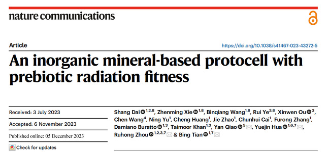2023年12月6 日,浙江大学生命科学学院生物物理研究所田兵教授、周如鸿教授和华跃进教授联合中科院化学所乔燕研究员在Nature Communications杂志在线发表题为“An inorganic mineral-based protocell with prebiotic radiation fitness”的研究论文,该研究提出了一种基于无机矿物质组装形成的具有电离辐射适应能力的原始细胞模型,揭示了由无机聚合物和寡肽分子或金属离子组装成的凝聚态液滴类细胞结构可能存在于原始地球,并通过该细胞模型中存在的一种非酶类抗氧化机制,在地球早期的极端环境中保护了其中生物活性分子免受辐射损伤,使早期生命的进化成为可能。匿名审稿人对文章高度评价,认为该工作在原始(人工)细胞研究领域向前迈出了重要的一步,同时具有更广泛科学意义上的影响力。论文被推选为Highlights论文,并受邀在Springer出版社、中国新闻社和科学网报道。