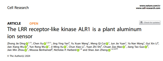 2024年1月10日,浙江大学生命科学学院郑绍建教授课题组在Cell Research在线发表了题为The LRR receptor-like kinase ALR1 is a plant aluminum ion sensor 的研究论文,发现了首个细胞铝离子受体,并揭示了从铝离子感知到下游解毒机制启动的完整信号通路,是植物抗铝研究的一个重大突破,同时也是植物生物学领域,特别是细胞感知离子及其信号转导途径研究的重大进展,为今后进一步挖掘细胞离子受体打开了一扇新的大门。