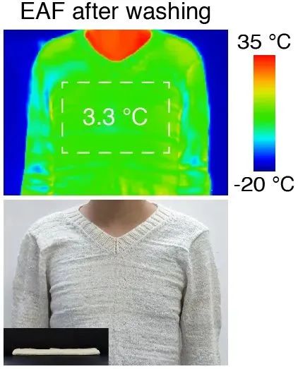 为了验证保暖效果,研究人员把学校食堂零下20摄氏度的恒温冷库变成了临时“试衣间”,在这里举办了一次“保暖挑战赛”。论文共同作者博士生张子倍同学担任模特,分别试穿初始温度相同的羽绒衣、羊毛毛衣、棉毛衫和“北极熊毛衣”,并记录衣物表面温度的上升情况。几分钟后,棉毛衫的表面上升到了10.8℃,羽绒衣的表面温度上升到了3.8℃。而厚度和羊毛毛衣接近,仅为羽绒衣三分之一到五分之一左右的“北极熊毛衣”表面仅上升到3.5℃——升温越少代表人体热量流失越少,“北极熊毛2.0”完胜了其他“对手”。“由于羽绒对于红外线的抑制效果差,所以要靠增加数倍的厚度才能达到同样的保暖效果。”吴明瑞说。