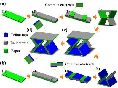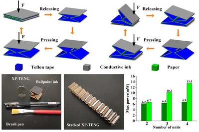Tragbare elektronische Geräte, wie Smartphone und Laptop, sind zur Notwendigkeit im alltäglichen Leben geworden. Die schnelle Entwicklung dieser Geräte profitiert enorm von erneuerbaren und umweltfreundlichen Batterien. Da solche kompakten und handlichen anziehbaren Dinge wie Sportarmbänder immer beliebter werden, ist es durchaus bevorzugt, dass effiziente, saubere und nachhaltige elektrische Energie zur Verfügung stehen sollen. Kürzlich hat ein Forschungsteam unter der Leitung von Dr. ZHU Zhiyuan vom Ocean College der ZJU einen neuartigen X-förmigen triboelektrischen Nanogenerator auf Papierbasis (XP-TENG) entwickelt, der sich durch eine minimalistische Struktur, ein geringes Volumen, geringe Kosten und hervorragende Energiegewinnung auszeichnet, um menschliche kinetische Energie zu gewinnen. Die Ergebnisse dieser Forschung wurden in der Zeitschrift Nano Energy veröffentlicht. XIA Kequan, Masterstudierender in Marine-Architektur und Marine Engineering, ist erster Autor des Beitrags und der korrespondierende Autor ist Dr. ZHU Zhiyuan. Zu Mitautoren gehören auch noch zwei Studierdenden DU Chaolin und WANG Rongji. TENGs stellen eine erschwingliche, umweltfreundliche und umweltfreundliche Energiegewinnungsmethode dar. Dr. ZHU Zhiyuan und andere stellen ein geniales XP-TENG vor, das von der Kugelschreiberfarbschicht abgeleitet wird, die durch das Malen mit einem kommerziellen Bürstenstift beschichtet wird. Das Papier und das Teflonband dienen als triboelektrische Paare, wobei das Papier als tragende Komponente funktioniert. Darüber hinaus ist der XP-TENG in der Lage, zwei Arbeitsmuster zu liefern, die ein erweitertes Anwendungsspektrum ermöglichen. Ein übereinander gestapelter XP-TENG zielt darauf ab, die Ausgangsleistung zu erhöhen und die mechanische Energie zu gewinnen, die durch die Bewegung des menschlichen Körpers erzeugt wird. Mit solchem XP-TENG können 101 blaue Hochleistungs-LEDs mit einer Arbeitsspannung von 3,4 V direkt bestrahlt werden. Der gefertigte XP-TENG kann zur Gewinnung von mechanischer Energie aus den menschlichen Laufbewegungen verwendet werden. Der XP-TENG kann sich an eine feuchte Umgebung anpassen und hat das Potenzial, im maritimen Ambiente zu arbeiten. „In Zukunft könnte das U-Boot-Suchlicht Energie aus menschlicher mechanischer Energie gewinnen“, sagt ZHU Zhiyuan.