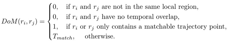 For things like checking in and punching the clock, RelationLine will count the number of track points that match. For a more complete set of track data, RelationLine calculates the sum of the matching duration of each track r (see Figure 1 and the following formula). In this way, data of different formats and precision will be matched with each other.