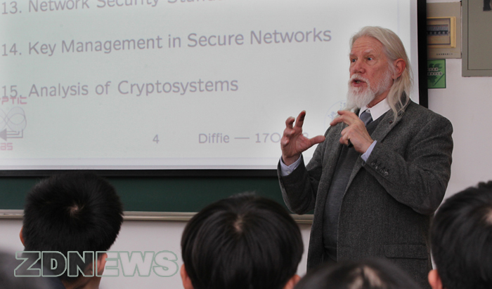 Pioneer of public-key cryptography and Turing Laureate Bailey Whitfield Diffie had his first lesson for undergraduates on Yuquan Campus today. Students from sophomore to senior coming from different campuses gathered for this first lecture.