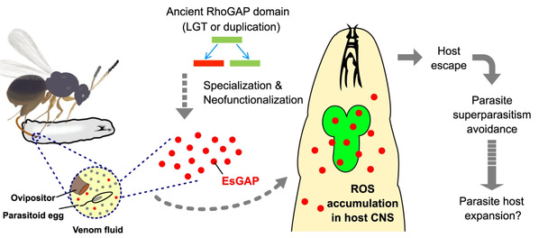 Leptopilina genus has some important parasitoid wasps of soft fruit pests, including some Drosophila species. Researchers discovered that two closely related species of Leptopilina—L. boulardi and L. heterotoma—are characterized by superparasitism avoidance. Therefore, these two parasitic systems are the ideal model for exploring the avoidance of intraspecific competition among parasitoid wasps. They first found that Leptopilina parasitism is often accompanied by the host escape response. By comparing escaped and non-escaped hosts, they detected noticeable superparasitism among non-escaped, i.e. they often had multiple parasitic eggs in their bodies, suggesting that host escape is a strategy that helps parasitoid wasps avoid intraspecific competition. It was further found that all escaped hosts had eggs laid and venom protein injected by the parasitoid wasps. By combining multi-omics data, researchers characterized a small set of RhoGAP genes (termed as Escape-related genes with a GtPase Activating Protein domain—EsGAP) that mediate the parasite’s manipulation of host escape by inducing reactive oxygen species in the host central nervous system. Functional studies revealed that this family of proteins can cause elevated levels of reactive oxygen species (ROS) in the central nervous system of the host larvae, thereby leading to the host escape behavior. The study finally traced the origin and evolution of such EsGAP genes and found that the RhoGAP structural domain, which is pervasive in eukaryotes, has evolved in a large number of independent replication events, and one of its branches is recruited and eventually specialized into a venom gland-specific expression gene by Leptopilina, fulfilling a new function in regulating host behavior.