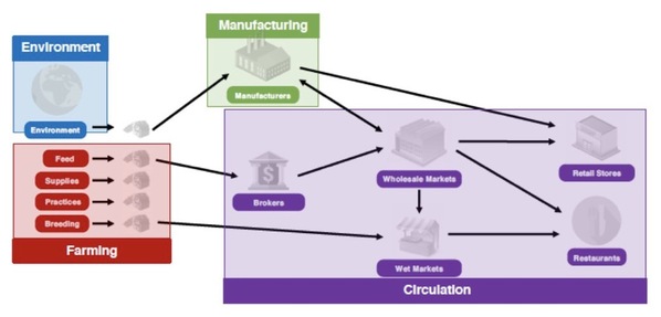 Agricultural production and upstream operations are decentralized and fragmented, while midstream distribution is characterized by multi-step systems that entail significant losses. To reach consumers, agricultural products transit through brokers, wholesale markets at their place of origin, secondary wholesalers, and retail-facing wholesalers before reaching wet markets, supermarkets, and other consumer channels. In addition, there are numerous downstream sales channels, including hypermarkets, supermarkets, wet markets, and online retailers. These multi-step systems present challenges to effectively managing food safety in China.