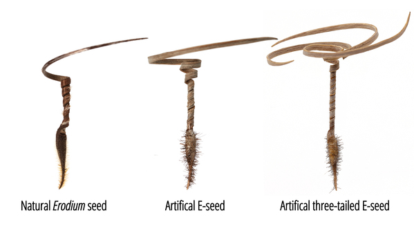 WANG: Our E-seed project has more advantages over real Erodium seeds. The Erodium seed has only one tail, which often makes it unsuccessful in forming an angle between the seed head and the ground, leading to a low success rate in its drilling into the soil. In contrast, our E-seed can be customized, for instance, by adding three tails to the seed, thus ensuring that the head maintains a fixed angle to the ground after aerial seeding and greatly increasing the success rate of soil drilling. In addition, we can change the body size and customize the double helix structure of the E-seed to meet different needs in various scenarios.