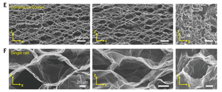 More than 90% of an aerogel is composed of micro- and nano-scale pores, typically honeycomb or arched in shape. GAO’s team replaced them with dome-shaped structures. “Conventional aerogels tend to have sharp-edged pores, while ours feature micron-scale domed surfaces,” explained Dr. PANG Kai, co-lead author of the study. Dome structures, commonly seen in nature and architecture, are noted for their exceptional load-bearing capacity and mechanical stability. “Egg cartons, for example, use domed hollows to absorb external impact more effectively,” PANG added.