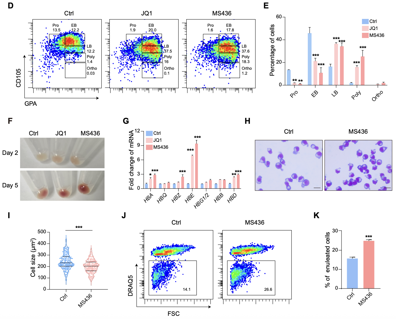 On July 1, 2025, Prof. HUANG He and ZHANG Meng from the First Affiliated Hospital, Zhejiang University School of Medicine, and Prof. QIAN Pengxu from the Zhejiang University School of Medicine co-published an article entitled 'BRD4 acts as a transcriptional repressor of RhoB to inhibit terminal erythropoiesis' in the journal Journal of Hematology & Oncology. This study revealed that BRD4, which typically functions as a transcriptional activator, inhibiting erythroid terminal differentiation by transcriptional silencing of small G protein RHOB. BRD4 inhibition was shown to promote erythroid maturation and enucleation efficiency in both hematopoietic stem cells and pluripotent stem cells.