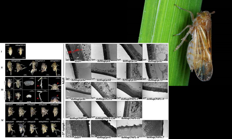 In this study, researchers use comprehensive large-scale technologies to study the full complement of CPs (i.e., the CP-ome) of the brown planthopper (BPH), Nilaparvata lugens, a major rice plant pest. They discovere eight CP families (CPR, CPF, TWDL, CPLCP, CPG, CPAP1, CPAP3, and CPAPn) including 140 proteins in BPH, in which CPAPn is a CP family. The CPG family that is considered to be restricted to the Lepidoptera has also been identified in BPH. As reported here, CPLCP family members are characterized by three conserved sequence motifs. In addition, they identify a testis protein family with a peritrophin A domain. They verify the real existence of 106 proteins among the 140 CPs. RNA interference (RNAi) experiments are conducted against 135 CP genes in early- and late-instar nymphs and newly emerged female adults, demonstrating that 32 CPs are essential for BPH normal development or egg production. Combined RNAi experiments suggest redundant and complementary functions of the large number of CPs. Transcriptomic data reveal that the CP genes are expressed in a tissue-specific manner, and there are four clusters of developmental expression patterns.