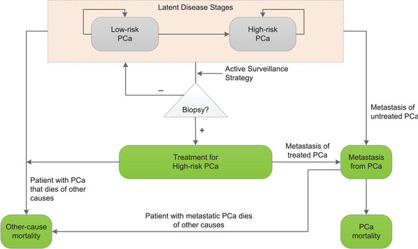 Fig. 2: Illustration of disease progression and decision-making for active surveillance for PCa