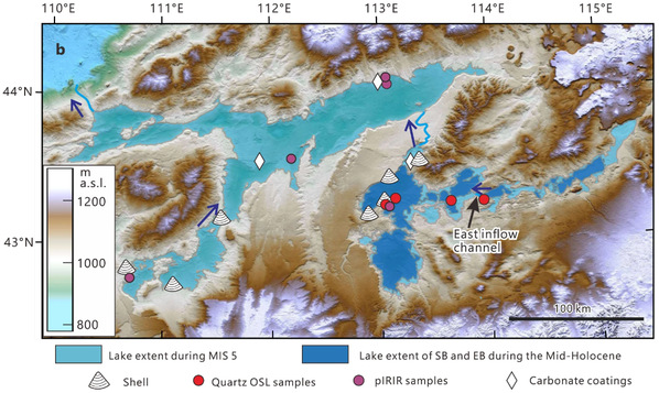 After years of fieldwork and laboratory analyses, the researchers discovered a series of evidence about the palaeohydrological landscapes, lacustrine and fluvial sediments and biological fossils in the northwestern margin of the Hunshandake Sandy Land and identified a large palaeohydrological network consisting of four former lakes. Using a combination of radiocarbon, uranium series and luminescence dating methods, they reconstructed two megalake systems over the last 120,000 years: Marine Isotope Stage 5 (about 80,000-120,000 years ago) and the mid-Holocene (about 6,000-7000 years ago). Paleolakes covered an area of 15,500km2 at their maximum extension during Marine Isotope Stage 5, the largest paleolake of the same period ever found in the Gobi Desert so far. The winter temperature during Marine Isotope Stage 5 was suggested to be 10°C higher than at present, and precipitation was likely to be as much as 2.2–2.5 times of modern values. During the mid-Holocene, the lake area was much smaller, but precipitation was shown to be still 1.8-2.1 times as much as today’s amount.