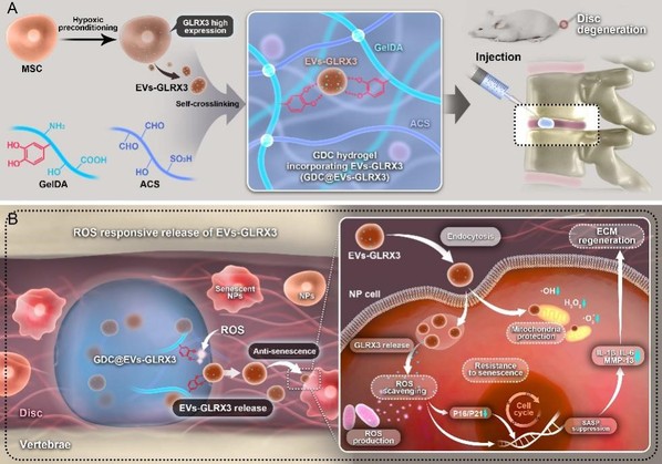 Using a hypoxic preconditioning method, the team developed GLRX3+ mesenchymal stem cell-derived extracellular vehicles (EVs-GLRX3), which enhanced the cellular antioxidant defense. Replenishing EVs-GLRX3 can balance redox homeostasis and attenuate mitochondrial damage and, thus, alleviate NP cell senescence.