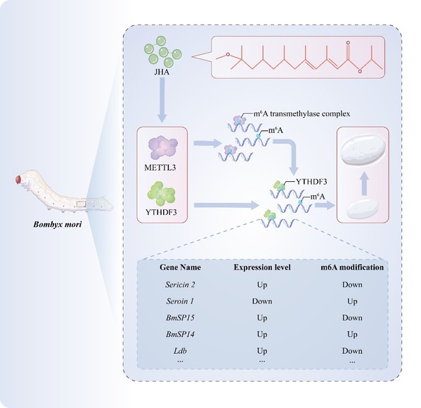 In recent scientific explorations, the application of insect juvenile hormone analogs has shown promise in augmenting the synthesis of silk proteins. However, the specific mechanism underlying this phenomenon has remained elusive. In the past few years, researchers have increasingly turned their focus to N6-methyladenosine (m6A) modification of RNA, recognizing its pivotal role in the growth and development of eukaryotic organisms. Despite its significance, there exists a scarcity of research concerning the role and mechanism of m6A in the physiology of domestic silkworms.