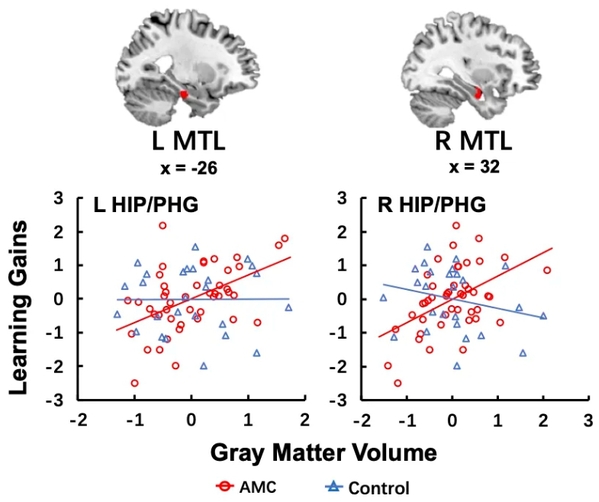 Through safe and non-invasive MRI scans conducted with parental consent, the research team identified structural and functional differences associated with math learning. Specifically, they found that the volume of gray matter in the bilateral hippocampus and its adjacent medial temporal lobe predicted the learning rates of math ability in AMC children over four years.