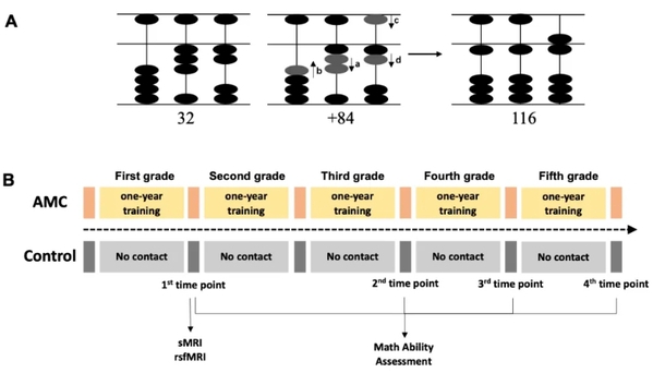 In addition to regular math classes, children in the AMC group underwent 2-hour weekly sessions of AMC training while the control group were provided with additional learning of conventional study materials, such as calculation and reading, for the equivalent duration as additional learning of abacus in the AMC group. The two groups were comparable in age, gender, and cognitive abilities. Subsequently, the research team evaluated the long-term learning outcomes by assessing the children's math proficiency from second to fifth grade.