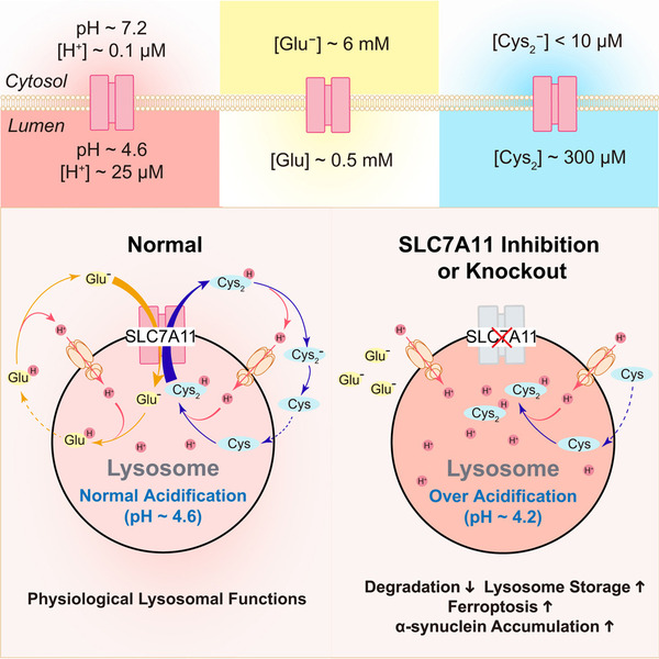 In the neurons without lysosomal SLC7A11 expression, lysosomal pH dropped below 4.6, compromising the hydrolytic activity of the lysosome, and so accelerating the aggregation of pathological α-synuclein-recapitulated in cells from an early-onset Parkinson's patient harboring a monoallelic loss-of-function (LOF) SLC7A11 mutation. Remarkably, the chloroquine, an FDA-approved drug, in a low-dose to optimally correct the over-acidified lysosome pH caused by SLC7A11 LOF mutation, significantly suppresses the aggregation of pathological α-synuclein.
