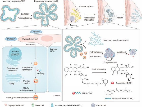 Following implantation into the post-surgical cavity in mice, the engineered organoids exhibited rhythmic contraction of myoepithelial cells, leading to the “secretion” of drug-loaded lipid droplets into surrounding tissues. Upon reaching the acidic tumor microenvironment, the prodrug undergoes cleavage, releasing active doxorubicin and ATRA to selectively eliminate residual tumor cells. ATRA further inhibits cancer stemness and helps overcome drug resistance. In a mouse model of breast cancer recurrence, the treatment reduced recurrence rates to 25%, with 75% of mice surviving beyond 100 days. Unlike conventional scaffold materials, organoids act as “living implants” that not only deliver therapeutics but also spontaneously integrate with host mammary tissue, reconstructing ductal architecture. Remarkably, the regenerated mammary tissue restored lactation function following pregnancy.
